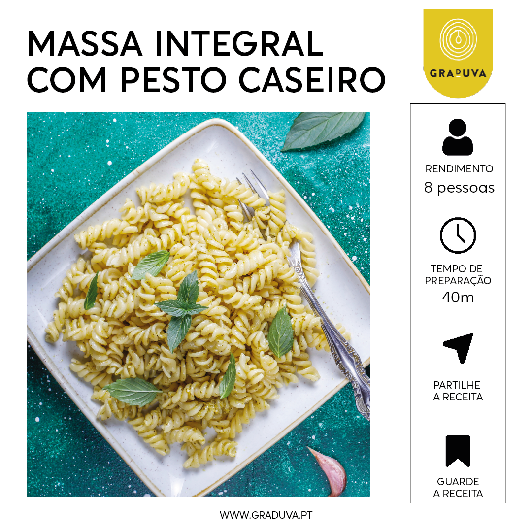 Que tal um jantar rápido e saudável? Massa integral com molho pesto, enriquecido com o nosso óleo de abacate Graduva. Uma refeição cheia de sabor e benefícios para a sua saúde. Vai experimentar?